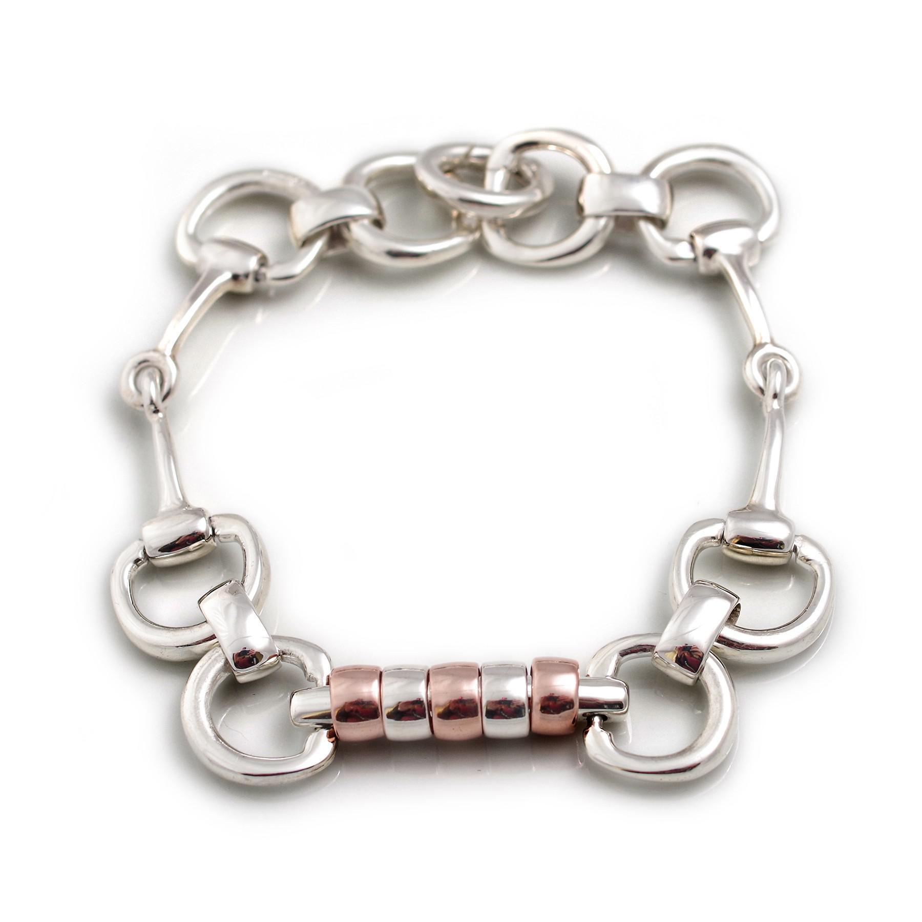 Sometimes we find that time is all we need to bring a new design into creation. Combining the two best selling designs that we have had for the past 20 years to give us this splendid combination of two full snaffle pieces with the iconic exclusive cherry roller as its centre piece. You can as ever with the cherry roller personalise it to be your own and as the centre to this stunning solid silver bracelet it is sure to draw admiring glances. We have made the clasp a super safe oval clip as we know all of our customers like to wear their Hiho jewellery all the time. Hand made and crafted by the finest silver smiths and assembled in the UK this we know will be a new iconic piece in the very near future.