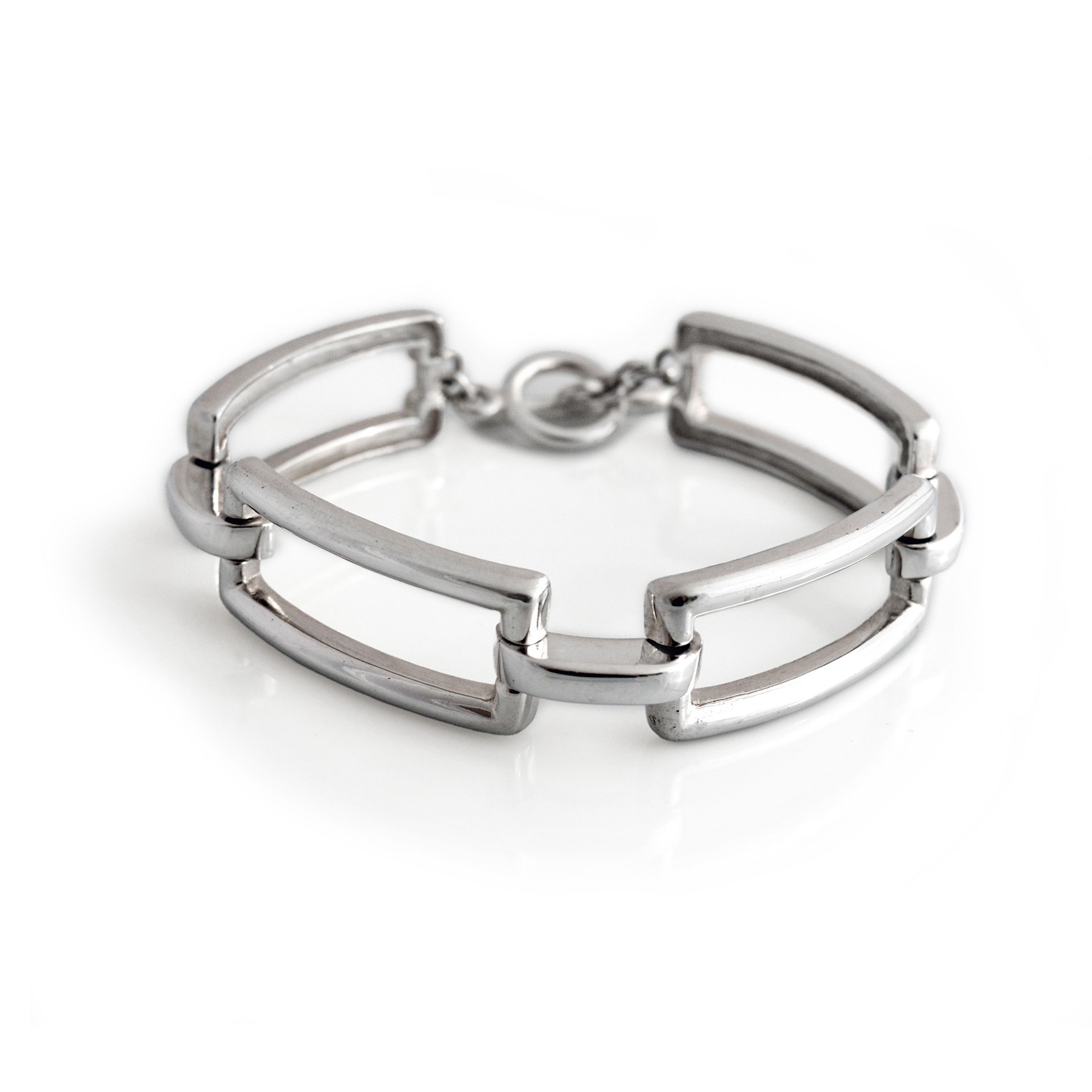 Sleek, modern, and effortlessly stylish, this sterling silver bracelet features a striking design of open rectangular links, beautifully crafted to create a contemporary statement piece. Each link is polished to a high shine, reflecting light with every movement.
