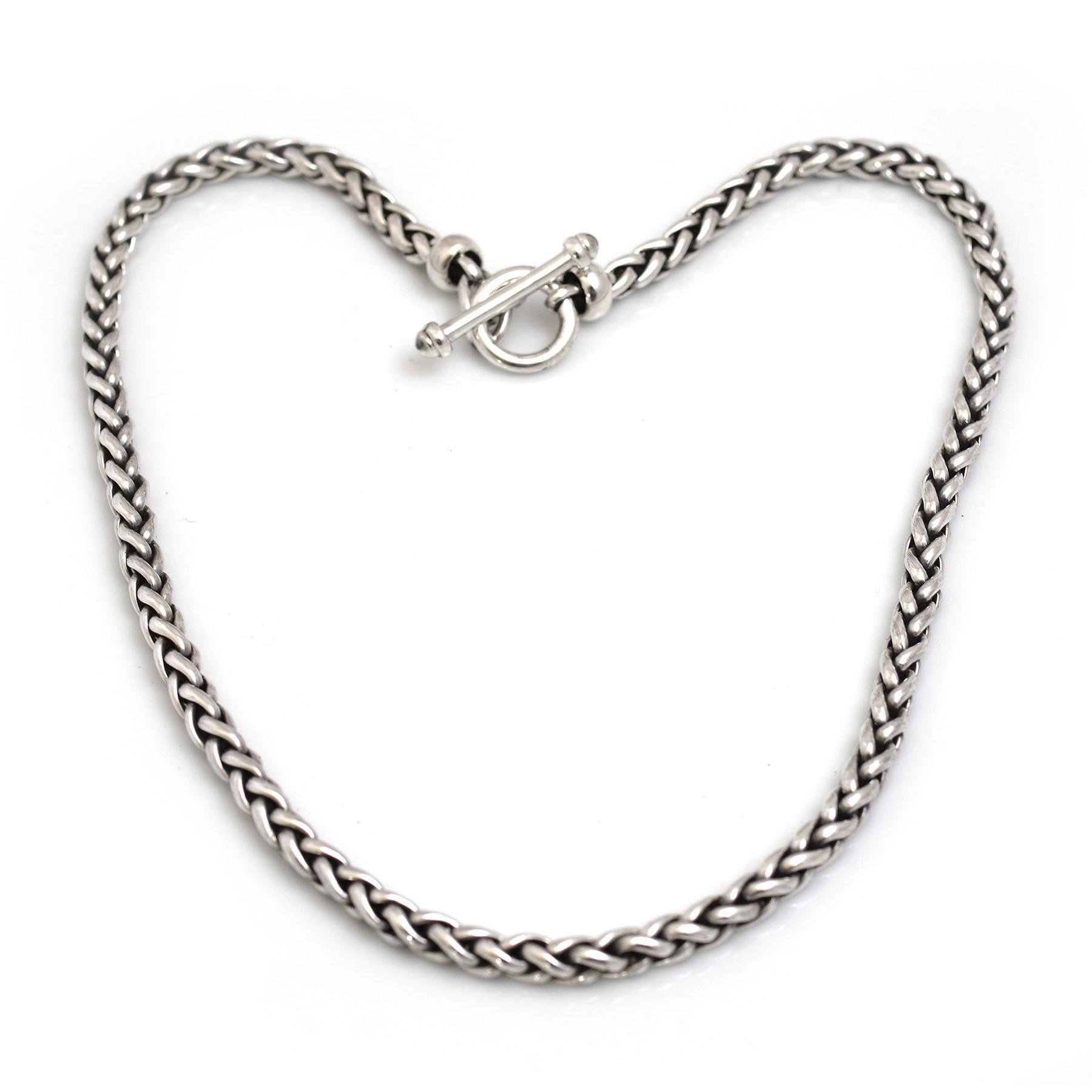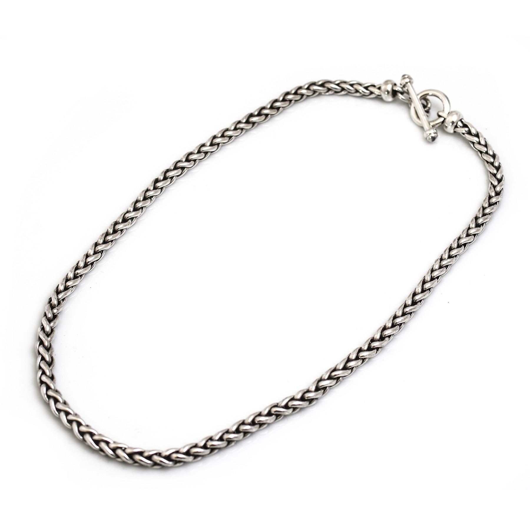 This cleverly plaited sterling silver link necklace is wonderful to wear everyday. The oxidisation inside the plait, sets off the woven silver to perfection and looks like a wheat sheaf. The solid t-bar clasp is robust and cool looking. This necklace is comfortable to wear and fits well with the Hiho mantra of "mucking out to going out". There is a matching unisex bracelet available in different lengths.