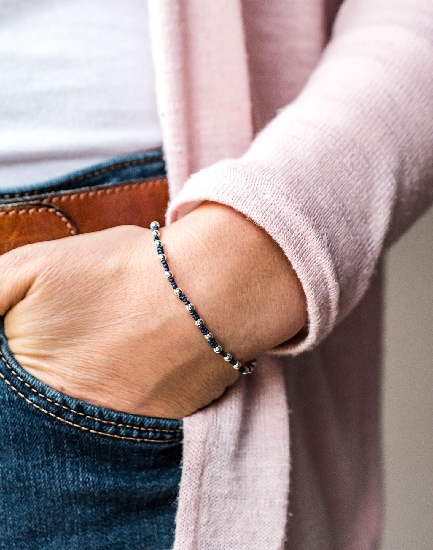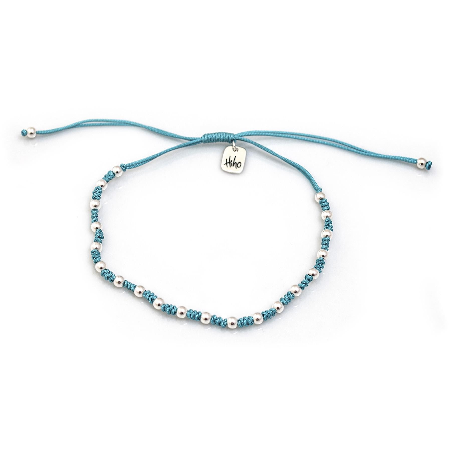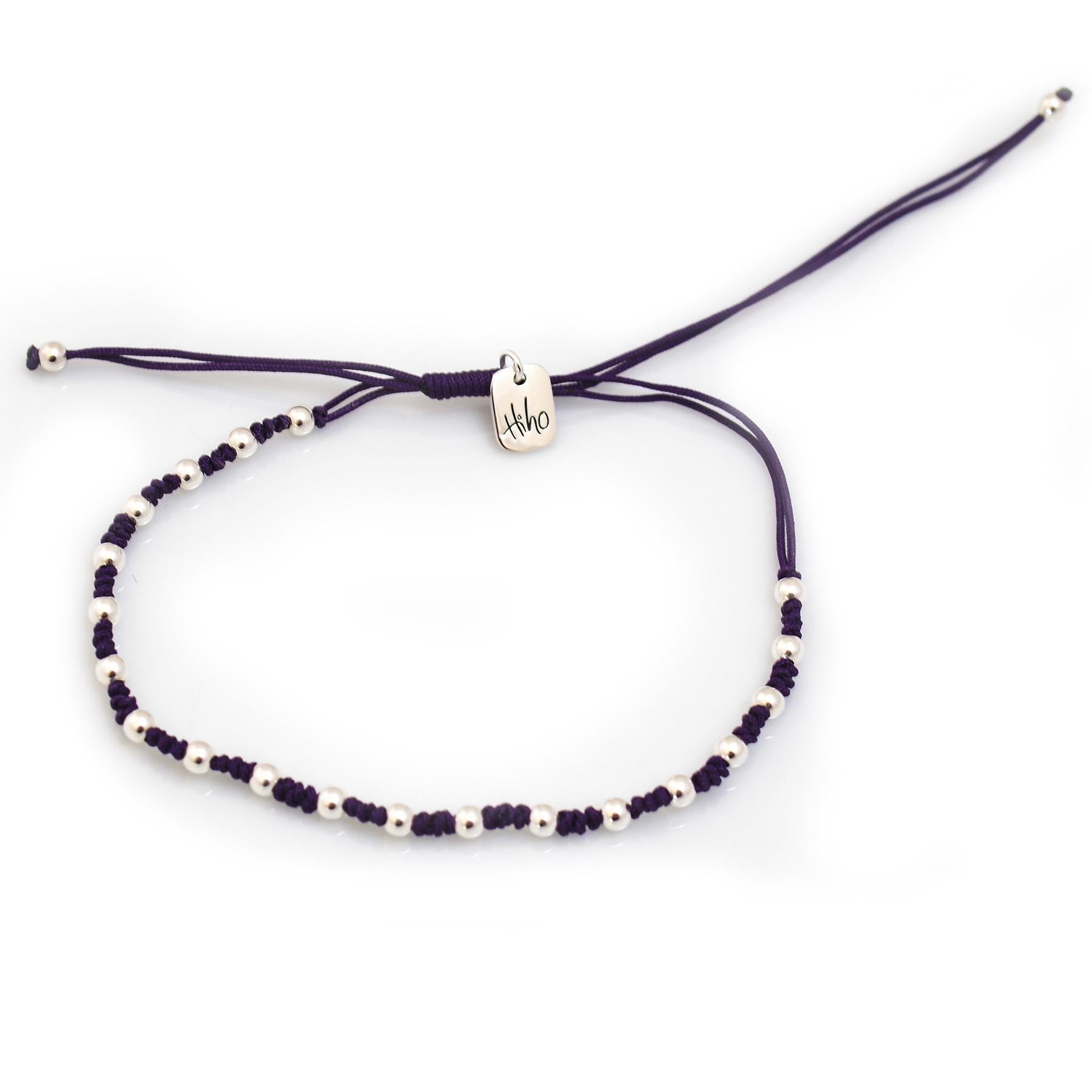• This is a great and ever-popular combination of sterling silver balls and strong silken cord and is available in three classic best selling colours of navy, purple and turquoise. With the Hiho silver tag denoting our design, this one-size-fits-all, easy-to-wear bracelet makes the perfect gift.