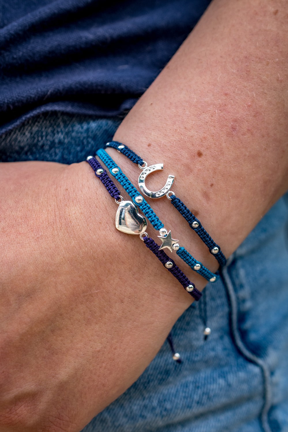These friendship bands are a new design for Hiho. Set with the shining silver star as they're centre piece and then with six solid silver beads woven into the strong Dooji cord. We are confident they are a great looking friendship band perfect for a gift to show your friend you care, or as a perfect not too expensive treat to yourself after all you have to love yourself too right. Available in three colours of Navy, Teal or Purple, which one will you choose?