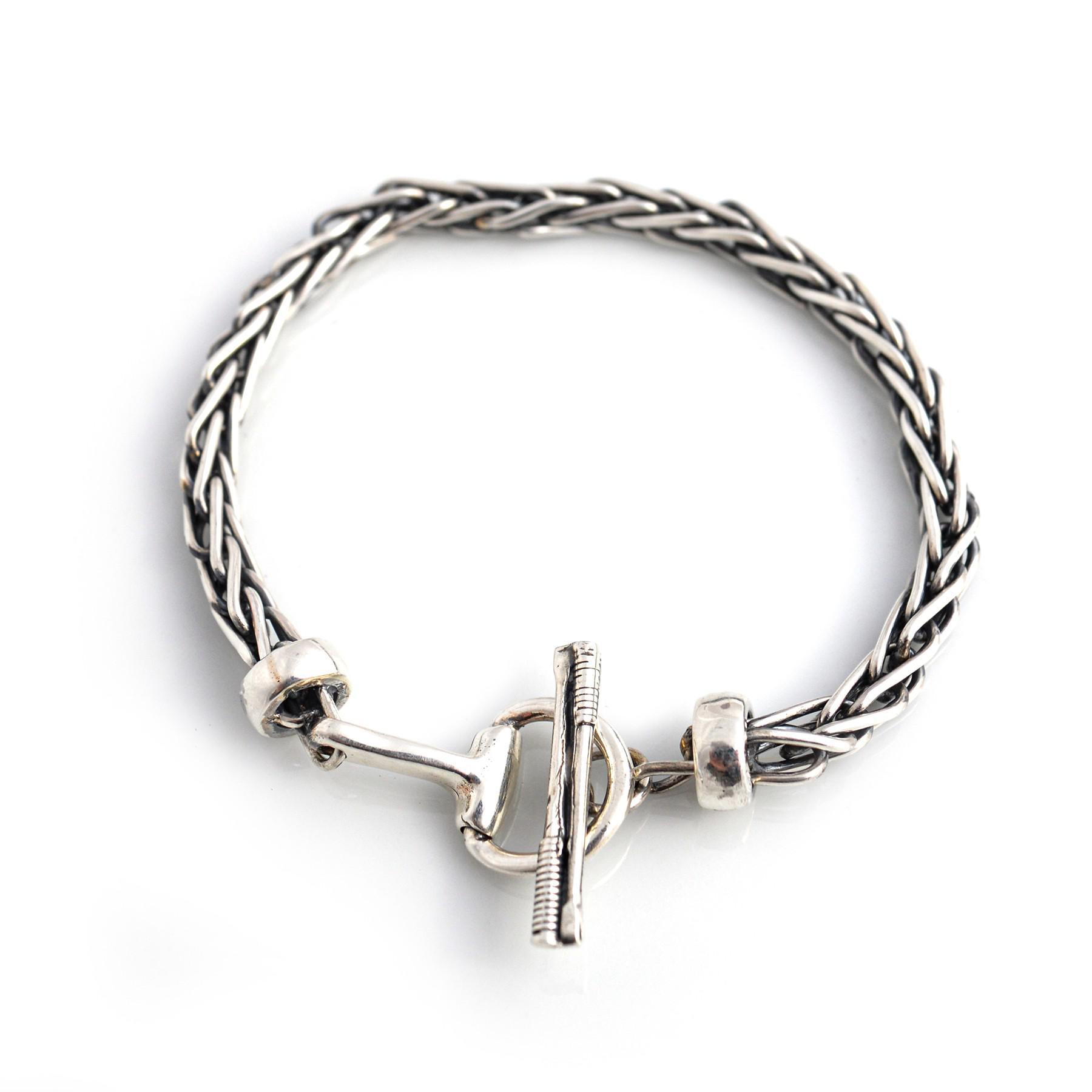 Here we have a gorgeous woven linked bracelet, where the solid silver wire has been oxidised inside the weave to give contrast and depth. The snaffle link and double whips t bar (a Hiho exclusive) makes a clever clasp where the whips feed through the snaffle clasp to keep the bracelet firmly in place.