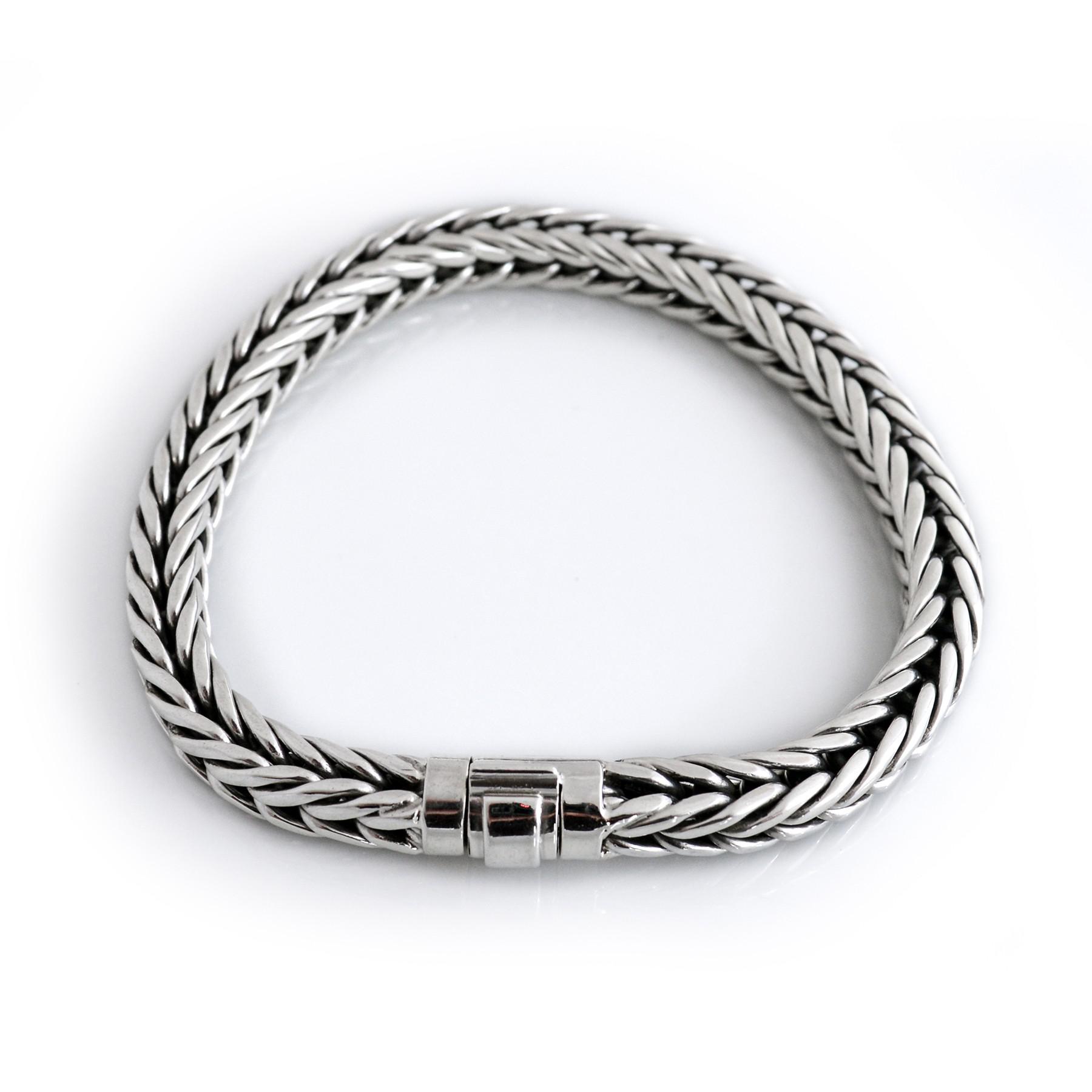 It’s so hard to find a simple silver mans bracelet with a bit of class and style but we think we have found the perfect design here. The strong solid silver wire is cleverly woven together to give a flexible yet classic look. The whole bracelet is then Oxidised (turned black) and just the outer surface is polished back to a silver shine, giving depth and a more masculine look. The clasp is a clever hook, with a snap closed top that means it is safe and secure and the sort of bracelet that can be worn all the time whatever you are doing.